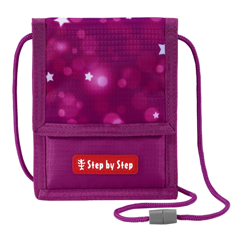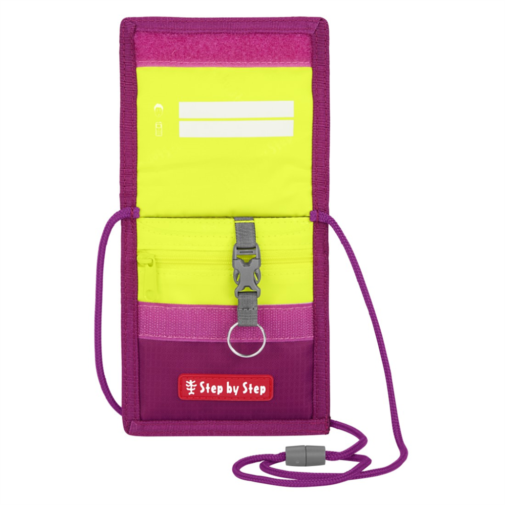 Detská peňaženka so šnúrkou a zapínaním na suchý zips. Vnútro obsahuje: prepážku na bankovky kapsu na mince so zipsom prepážka na kartičky krúžok na kľúče priehľadná PVC kapsa so zapínaním na zips na zadnej strane peňaženky Dĺžka šnúrky: 40 cm Materiál: 100 % polyester.