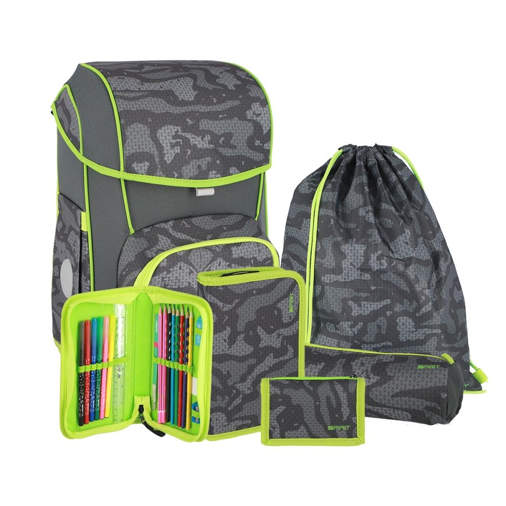 Sada obsahuje: školskú tašku, vrecko na prezúvky, naplnený peračník, okrúhle puzdro, peňaženku a nášivku na suchý zips s dizajnom na ozdobenie tašky.