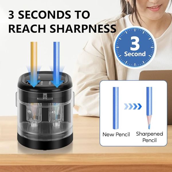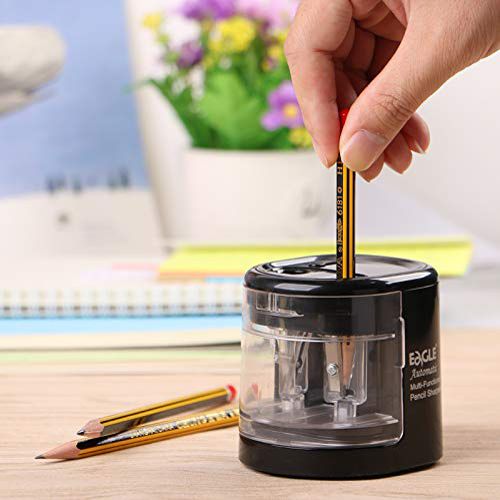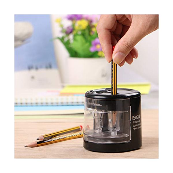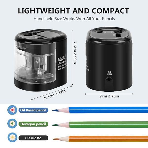 Automatické strúhadlo na ceruzky dvoch rozmerov 6-8 mm a 9-12 mm. Strúhadlo obsahuje odpadovú nádobu . Napájanie zo siete 230V, súčasou balenia je adaptér alebo na batérie - 4x AA 1,5V nie sú súčasťou balenia. Rozmer: 84x72x76 mm.