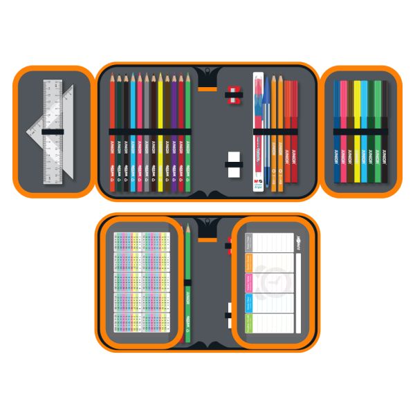 Naplnený, 1-poschodový peračník JUNIOR s rozvrhom hodín a malou násobilkou. Vlastnosti: ľahko umývateľný vonkajší povrch zosilnené prešívané steny vo vnútri peračníka 2 vyklápacie chlopne…