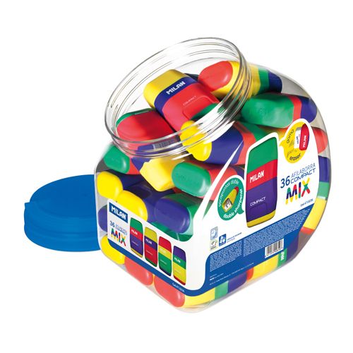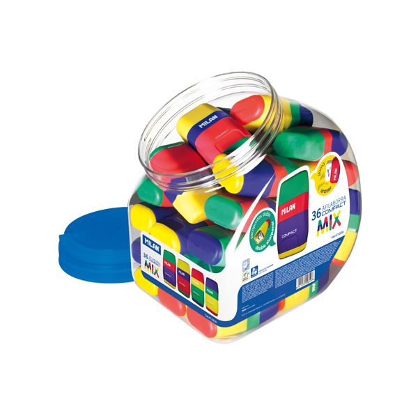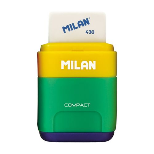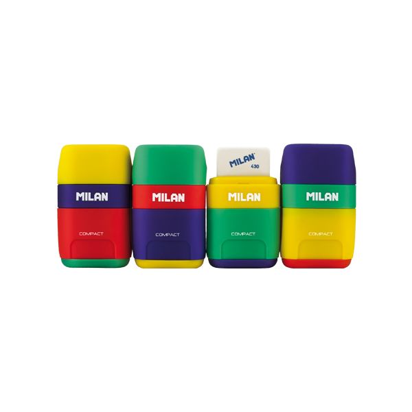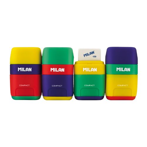 Kombinovaná guma a dvojité strúhadlo MILAN Capusle Mix so zásobníkom v jednom. Strúhadlo má dvojité otvory na ceruzku: jeden štandard a jeden MAXI. Guma je schovaná pod vrchnákom. Ostrá, odolná uhlíková čepeľ strúhadla, so systémom ktorý zabraňuje oddeleniu čepele od tela strúhadla. Ideálne pre školákov a študentov. Guma sa dá dodatočne vymeniť za gumu MILAN 430. Milan Compact má špeciálny pogumovaný povrch, ktorý si zamilujete.