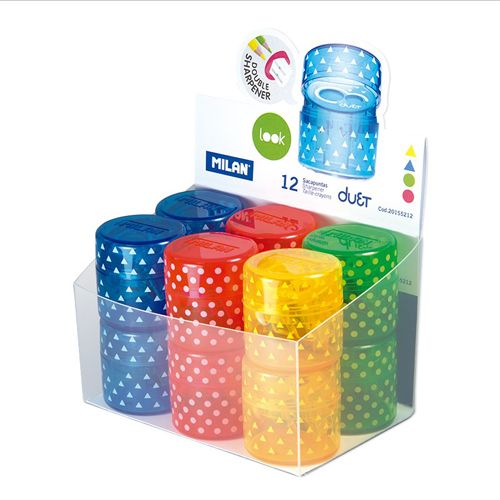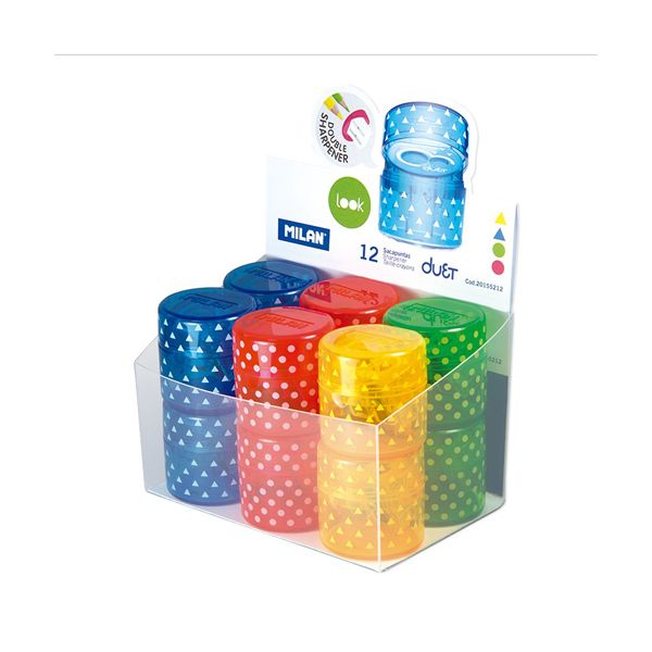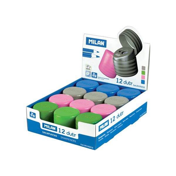 Strúhadlo MILAN Duet obojtsranné, ideálne pre klasické grafitové ceruzky a farebné pastelky. Ostrá, odolná uhlíková čepeľ. Vybavené bezpečnostným systémom, ktorý zabraňuje oddeleniu čepele od strúhadla. Vhodné pre použitie v škole aj kancelárii. V štyroch farbách.