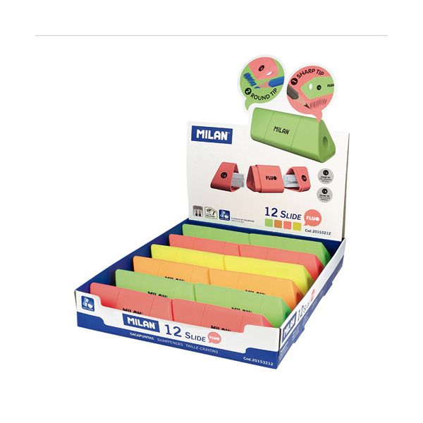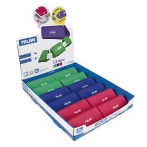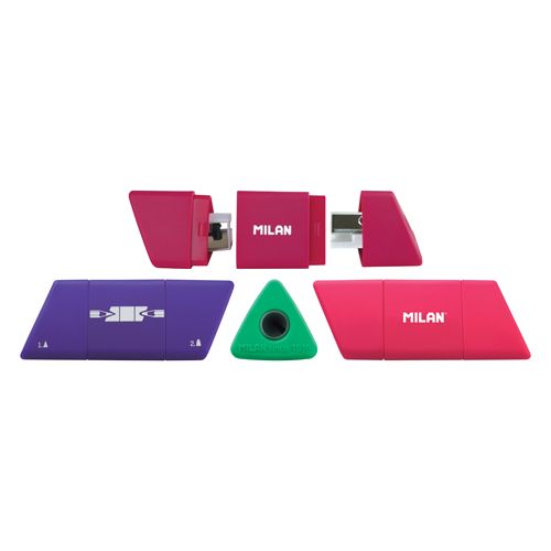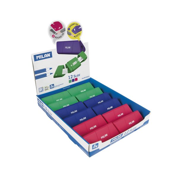 Strúhadlo MILAN Slide obojtsranné, ideálne pre klasické grafitové ceruzky a farebné pastelky. Ostrá, odolná uhlíková čepeľ. Vybavené bezpečnostným systémom, ktorý zabraňuje oddeleniu čepele od strúhadla. Vhodné pre použitie v škole aj kancelárii. V troch farbách.