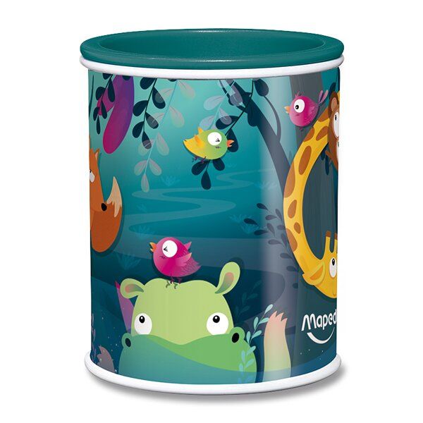 Kovové strúhadlo Maped Can Jungle Fever s veľkou odpadovou nádobkou a 2 otvormi v atraktívnom dizajne s motívmi zvieratiek z džungle.