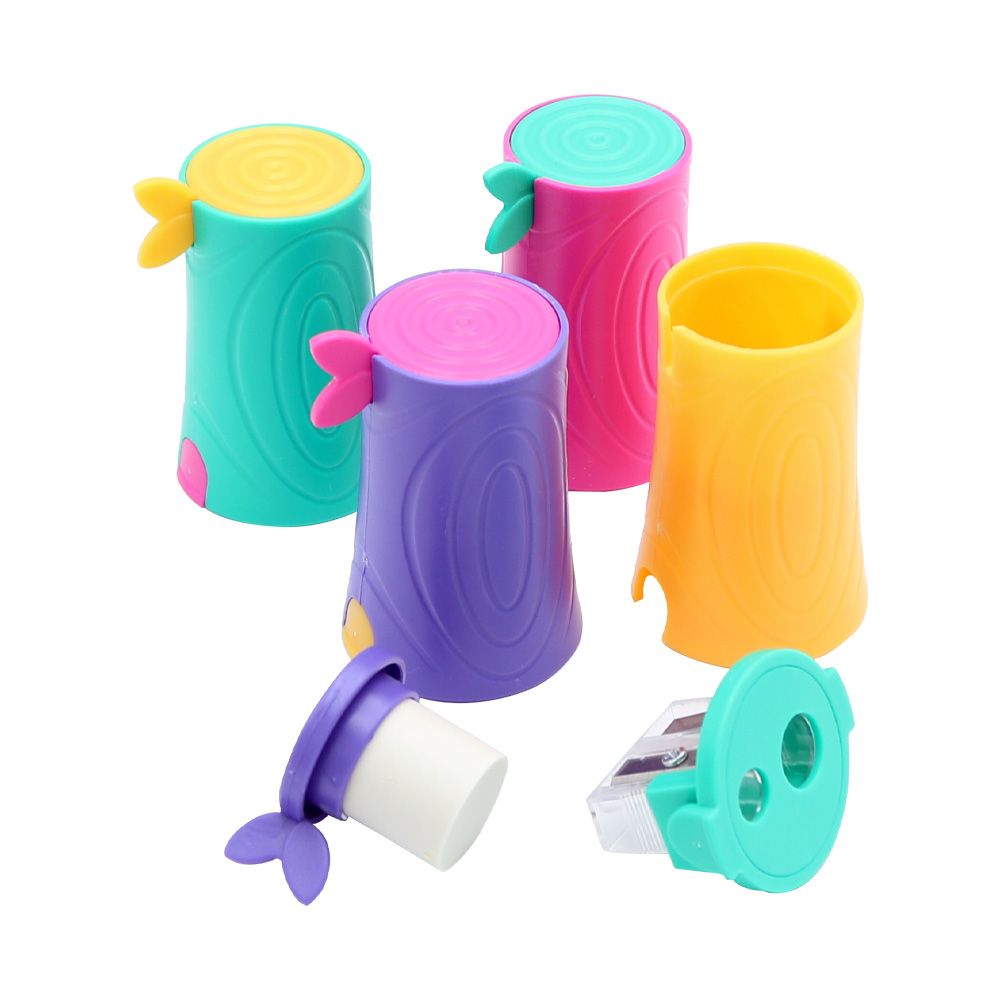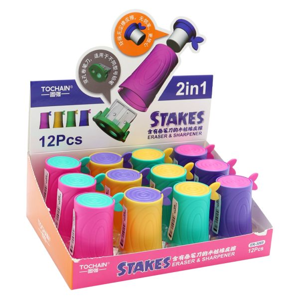 Dva v jednom - struhadlo (orezávatko) na ceruzky /pastelky + guma ukryté v kužeľovitom tele. dva otvory pre ceruzky 8 a 12 mm (v spodnej časti) stredne tvrdá, bezprašná, ekologická guma o priemere…