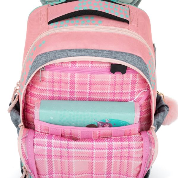 - Hlavná komora je spracovaná tak, aby sa do nej pohodlne vošli školské dosky (rozmery dosiek: 32 x 22,2 x 5 cm), zošity veľkosti A4 alebo ťažšie učebnice