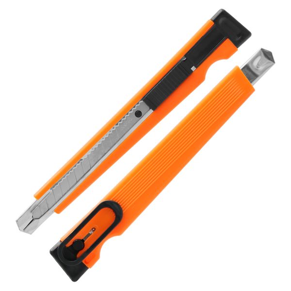 Malý orezávací nôž celokovový, vyrobený z ušľachtilej ocele, s nastaviteľnou vysúvacou a olamovacou čepeľou vysúvané pomocou polohovacieho jazdca so zarážkami, šírky 9 mm, dodávaný na blistri. Rozmer: 130x5x10mm.