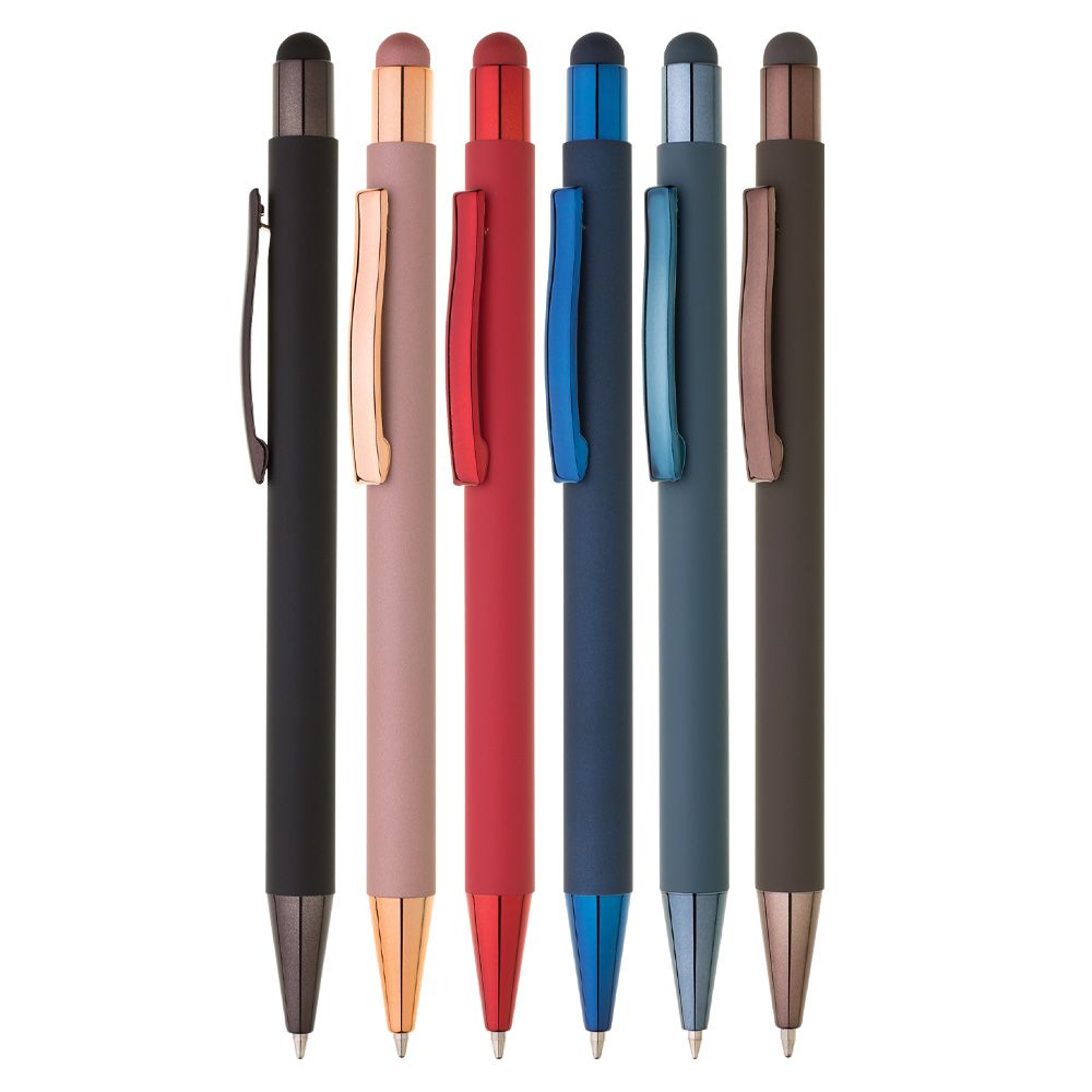 Pogumované matné telo pera doplňujú lesklé doplnky vo farbe tela a matný touch koniec (mix 6 farieb).