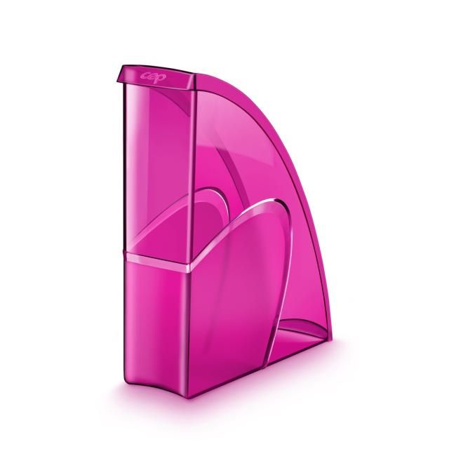 Stojan na časopisy s možnosťou vertikálneho alebo horizontálneho postavenia má elegantné línie, zvýraznené materiálom s kontrastným matným povrchom na hladkom pozadí. Vhodný na dokumenty do veľkosti 24 × 32 cm. Kapacita 700 listov (80 g / m²), rozmery 270 × 85 × 310 mm. Materiál 100% recyklovateľný vysokokvalitný plast. Väčšie balenie 10 ks. Farba transparentná ružová.