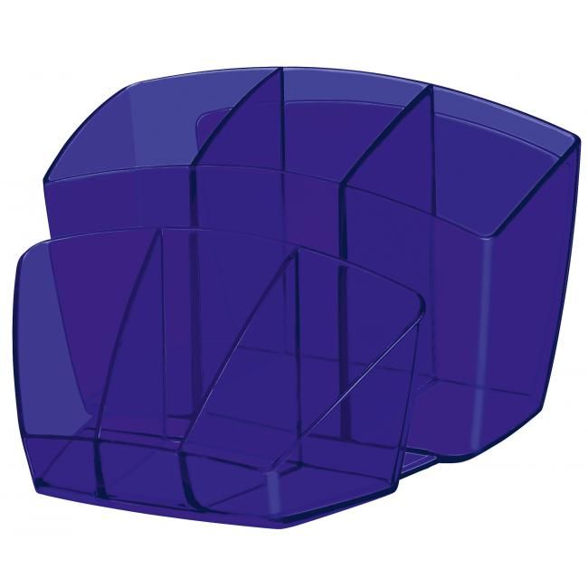 Dômyselne navrhnutý kompaktný a elegantný stolný organizér na kancelárske príslušenstvo. Kapacita: 40 pier, 5 zvýrazňovačov a 3 všeobecné priehradky. Na spodnej časti protišmyková podložka. Celkové rozmery 143 × 158 × 93 mm. 100% recyklovateľný, vysokokvalitný plast. Väčšie balenie 6 ks. Farba transparentná modrá.