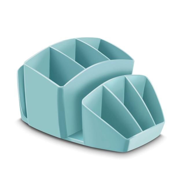 Dômyselne navrhnutý kompaktný a elegantný stolný organizér na kancelárske príslušenstvo. Kapacita: 40 pier, 5 zvýrazňovačov a 3 všeobecné priehradky. Na spodnej časti protišmyková podložka. Celkové rozmery 143 × 158 × 93 mm. 100% recyklovateľný, vysokokvalitný plast. Väčšie balenie 6 ks. Farba mentolová.