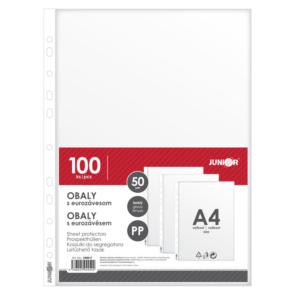 Priehľadný číry euroobal z polypropylénu. Otvor zhora, eurodierovanie, povrch lesklý a hladký. Formát A4.Balenie 10 ks v sáčku.