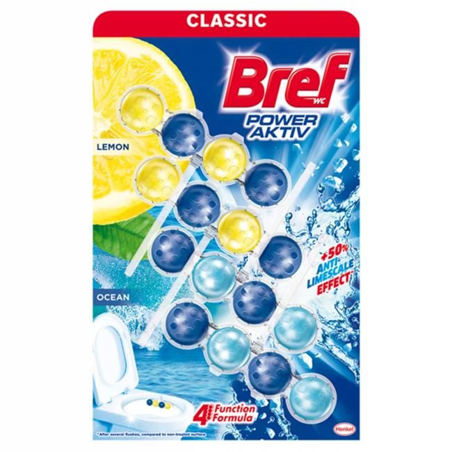 Bref Power Aktív WC blok s vôňou citrónu & oceánu a o plus 50% vyšším účinkom proti vodnému kameňu. Hľadáte jednoduchší spôsob, ako udržať vašu toaletu čistú a sviežu? Bref WC blok je jednoduchým a pohodlným spôsobom, ktorý zaisťuje čistotu a sviežosť vo vašej toalete od prvého do posledného spláchnutia.