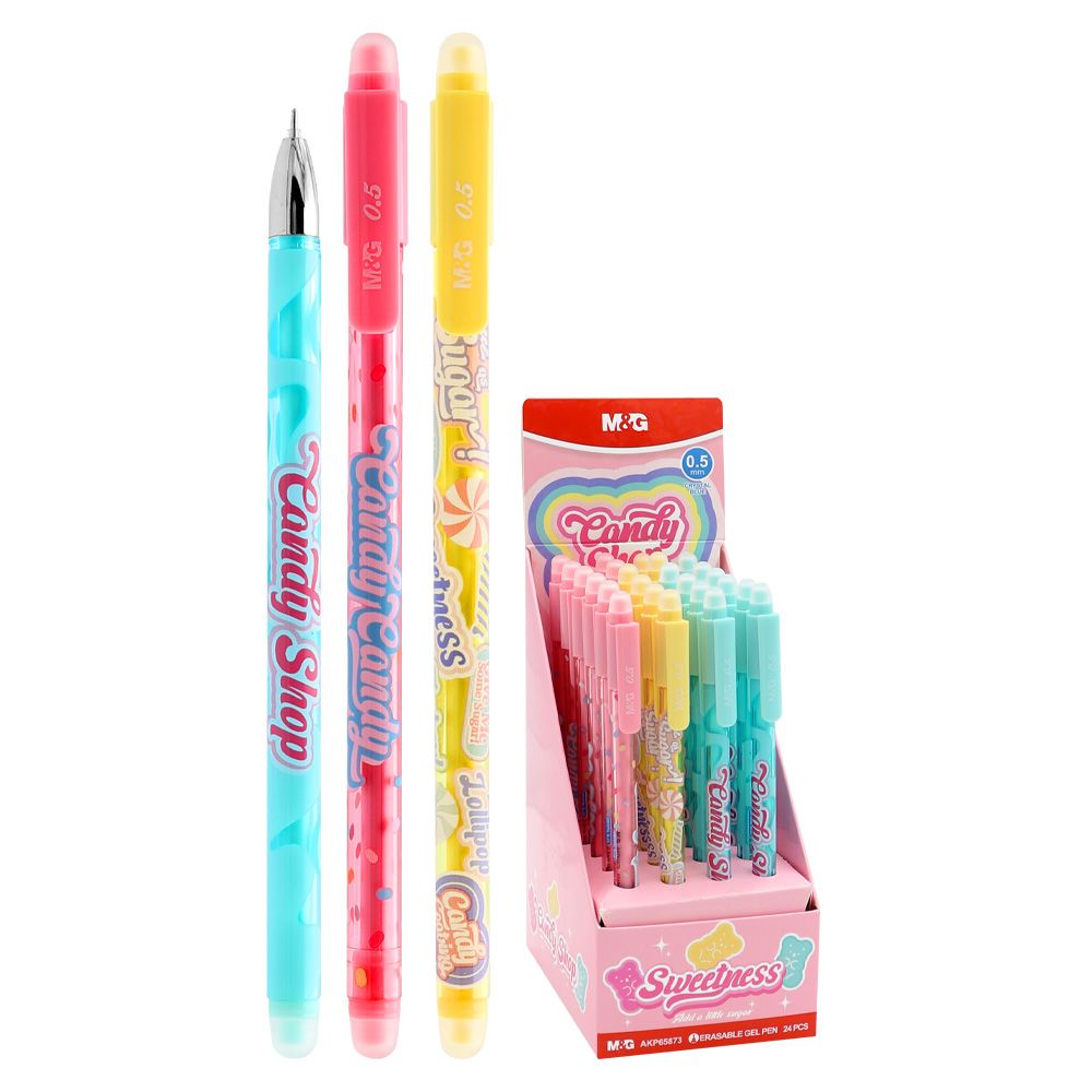 Gumovací roller od značky M&G. Predáva sa v troch farebných variantoch. Farba atramentu je modrá. Stopa hrotu je 0,5 mm. Na vrchnáku je pridaná guma, aby ste mohli opraviť chyby. Nie je vhodné na oficiálne dokumenty.