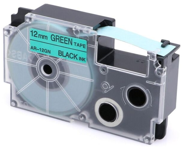 Prémiová páska Casio XR-12GN1, 8m, 12mm vo farbe čierna tlač / zelený podklad poskytuje vynikajúcu kvalitu tlače, zvýšenú odolnosť a profesionálny vzhľad pre náročné aplikácie.