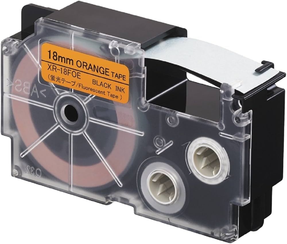 Prémiová páska Casio XR-18FOE, 8m, 18mm, fluorescent vo farbe čierna tlač / oranžový podklad poskytuje vynikajúcu kvalitu tlače, zvýšenú odolnosť a profesionálny vzhľad pre náročné aplikácie.
