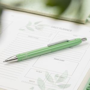 Jednorazové guličkové pero s transparentným čírym telom, so zakončením a uzáverom vo farbe náplne. Zelená farba a priemer 1,0 mm.