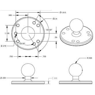RAM-B-202U kruhový adaptér / úchyt na rovné povrchy s 1" čapom. Adaptér má priemer 6,35 cm a má predvrtaných 7 dier, z toho 4 podľa priemyselného vzoru dier AMPS.