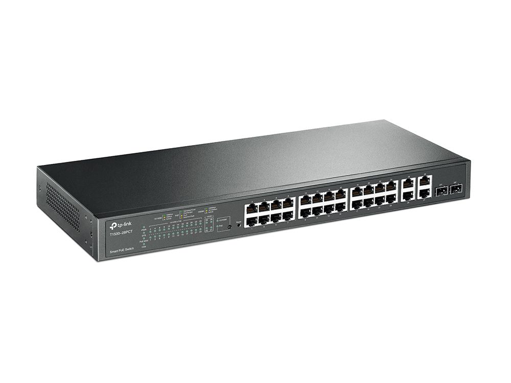 Smart switch TP-Link T1500-28PCT je vybavený 24 portami RJ45 s rýchlosťou 10/100Mbps, 4 portami RJ45 s rýchlosťou 10/100/1000Mbps a 2 kombinovanými sloty Gigabit SFP. Všetky porty RJ45 s rýchlosťou 100 Mb/s podporujú štandard 802.3at/af (PoE+) s celkovým rozpočtom PoE 192W a užitočnými funkciami správy napájania PoE. Prepínač poskytuje vysoký výkon, podnikovú úroveň QoS, užitočné bezpečnostné stratégie a bohaté funkcie správy vrstvy 2.