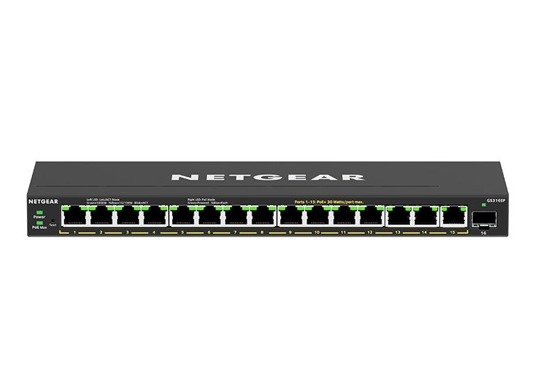 Netgear GS316EP 16-portový prepínač PoE+ Gigabit Ethernet Plus (180 W) s 1 portom SFP. NETGEAR 16-portový switch PoE+ Gigabit Ethernet Plus poskytuje základné funkcie podnikovej siete a napája zariadenia PoE+, ako sú telefóny VoIP, IP kamery a ďalšie.