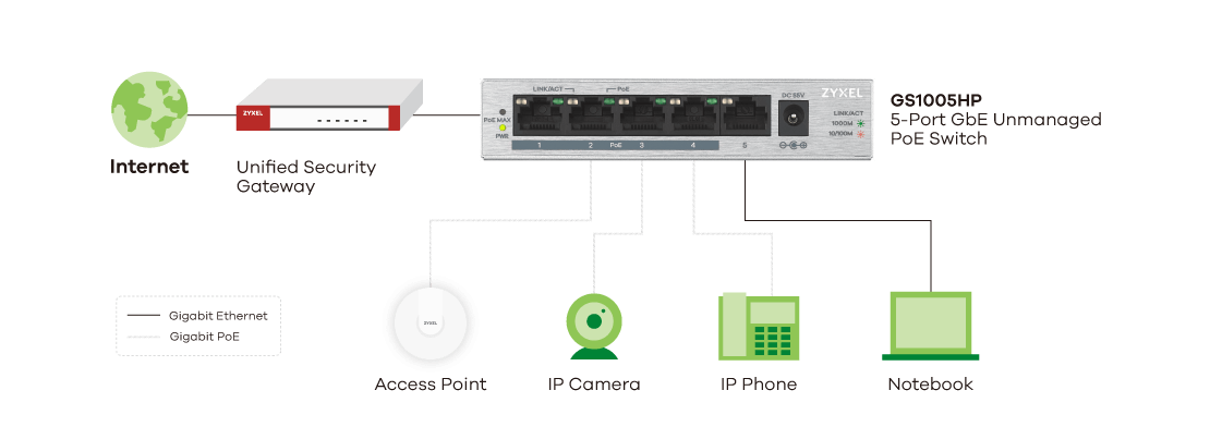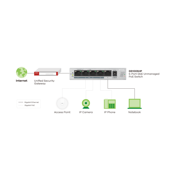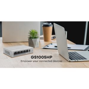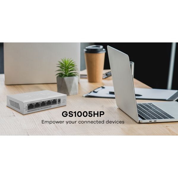 Zyxel GS1005HP je vybavený 5 gigabitovými ethernetovými portami, z ktorých 4 sú PoE porty, ktoré dokážu poskytnúť až 60 W celkového PoE rozpočtu. Model GS1005HP sa môže jednoducho pripojiť k zariadeniam PoE ready do vašej siete s dizajnom plug-and-play a zároveň poskytuje výhody šetriace energiu bez zníženia výkonu. Model GS1005HP napĺňa dlhotrvajúcu dieru na trhu s neoriginálnymi prepínačmi PoE, ktoré majú štandard 802.3at, má vysoký výkonový rozpočet a sú dostupné pre SOHO a malé podniky.