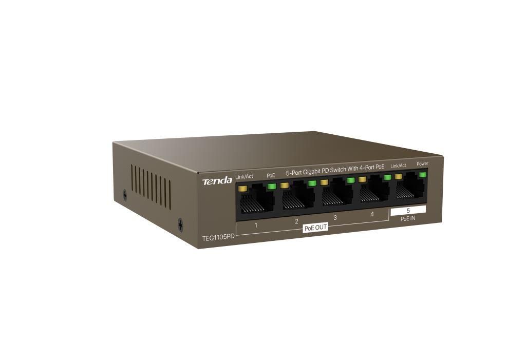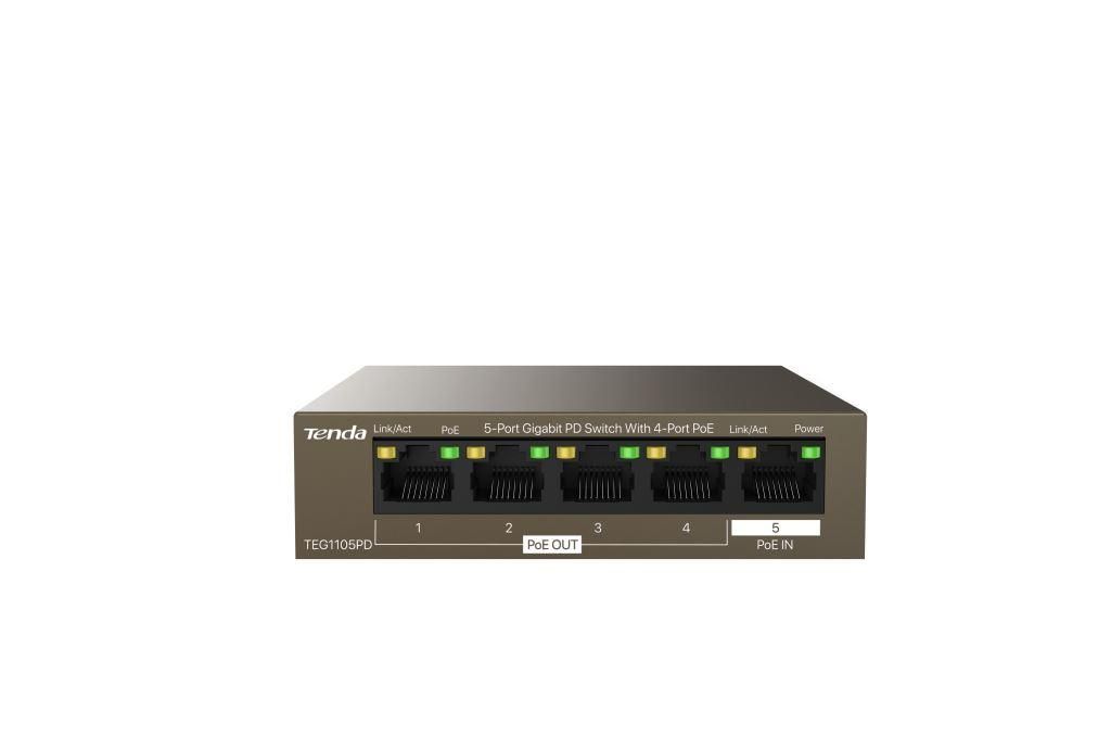 Tenda TEG1105PD prepína dáta pomocou 5 portov RJ45 s prenosovou rýchlosťou 10/100/1000 Mb/ss automatickou detekciou rýchlosti. Port 5 je určený na pripojenie do siete a tiež na napájanie switcha. Je nutné do tohto portu "posielať" tiež PoE napájanie IEEE 802.3at 30W z predchádzajúceho zariadenia v sieti. Zostávajúce 4 PoE porty podporujú PoE 802.3af pre napájanie ďalších koncových zariadení. Switch podporuje stabilné 8 jadrové PoE napájanie, ochrana proti prepätiu 6kV. Podpora prepojovania uzlov v móde Store-and-Forward. Full-duplex kontrola toku 802.3x, half-duplex kontrola toku v režime Back-Pressure. Switch je tiež vhodný do kancelárií, pretože neobsahuje žiadne ventilátory, je fanless.