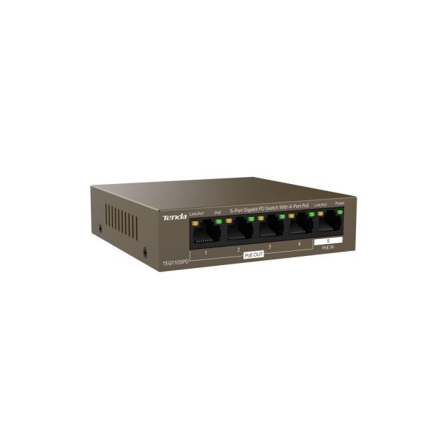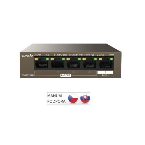 Tenda TEG1105PD je 5-portový Gigabitový Ethernet PoE switch. Je napájaný pomocou PoE a zároveň napája ďalšie zariadenia pomocou PoE. 1 port je pre napájanie switchu a ďalšie 4 PoE porty 10/100/1000 Mb/s podporujú PoE 802.3af (celkom 4 porty 30 W). Fanless, bez ventilátora.
