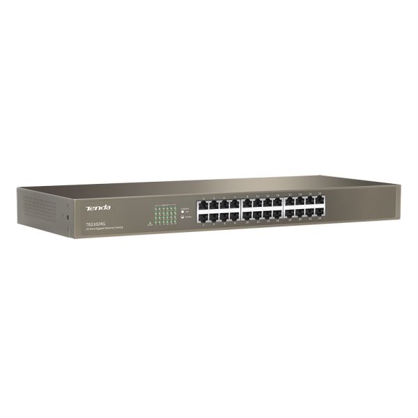 Tenda TEG1024G prepína dáta pomocou 24 portov RJ45 s prenosovou rýchlosťou 10/100/1000 Mb/ss automatickou detekciou rýchlosti. Switch disponuje ochranou proti prepätiu 6000 V. Podpora prepojovania uzlov v móde Store-and-Forward. Full-duplex kontrola toku 802.3x, half-duplex kontrola toku v režime Back-Pressure. Maximálna priepustnosť 48 Gb/s. Balenie obsahuje kovové "L" držiaky na montáž do rozvádzača. Switch je napájaný interným zdrojom.