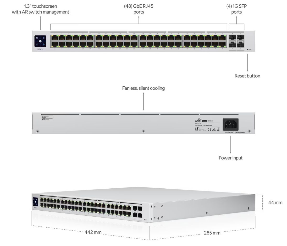 USW-48 je plne managovateľný switch so 48x 1Gbps ethernet portami a 4x 1Gbps SFP porty.