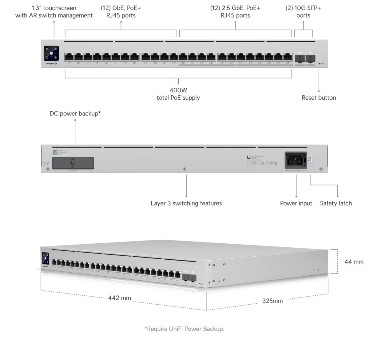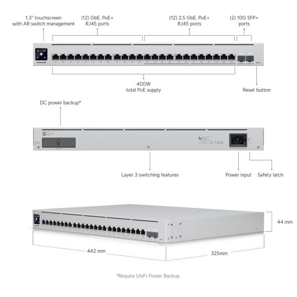 Všetky ethernetové porty podporujú 802.3af/at PoE-Out s výstupným výkonom 30W/port a celkovým PoE Budgetom 400W. Switch má okrem štandardnej výbavy aj 1,3" dotykový displej pre poskytovanie informácií o systéme, teplote, štatistike portov, PoE napájania a mnoho ďalšieho.