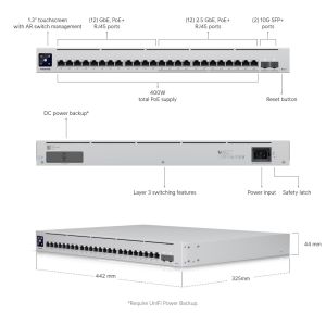 UniFi Switch Enterprise 24 PoE je spoľahlivý managovateľný 2,5-Gigabitový L3 Switch s kapacitou prepínania 124Gb/s, (12) 2,5-Gigabit LAN portami, ďalšími (12) Gigabit LAN portami a dvoma SFP+ (10Gb/s) šachtami.
