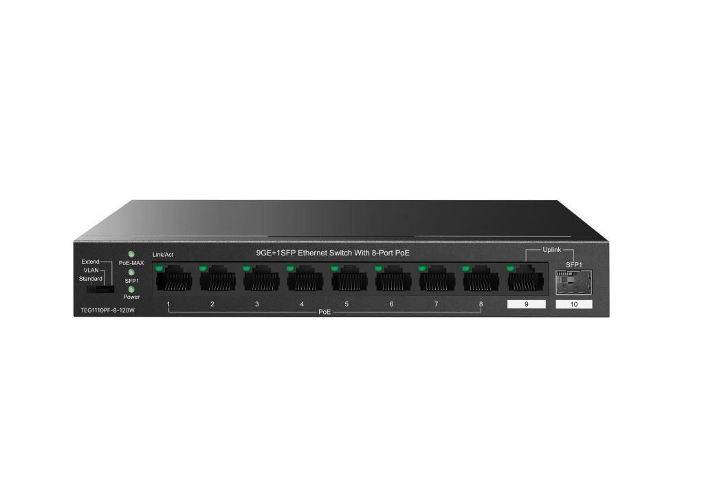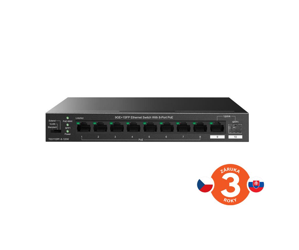 Tenda TEG1110PF-8-120W prepína dáta pomocou 9 portov RJ45 a optického SFP slotu. 8 portov 10/100/1000 Mb/s podporuje napájanie PoE802.3af/at, ďalší 1 port RJ45 10/100/1000 Mb/sa SFP slot s rýchlosťou 100/1000 Mb/s sú určené pre Uplink. SFP moduly odporúčame značky Signamax. Switch má ochranu proti prepätiu 6kV. Podpora prepájania uzlov v móde Store-and-Forward. Full-duplex kontrola toku 802.3x, half-duplex kontrola toku v režime Back-Pressure.