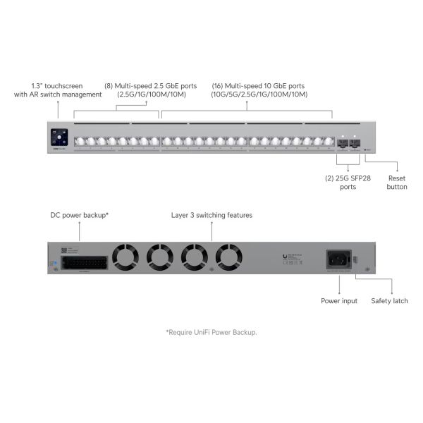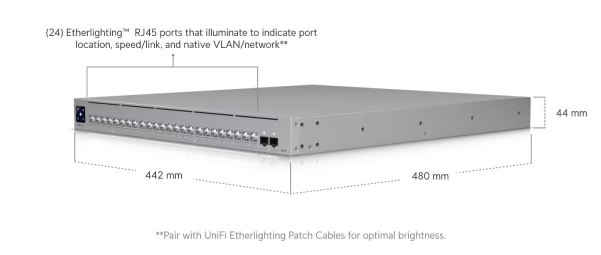 Ubiquiti Pro XG 24 Technické špecifikácie Rozmery: 442 × 480 × 44 mm Rozloženie portov: * 2,5 GbE RJ45: 8 (2,5G/1G/100M/10M) * 10 GbE RJ45: 16 (10G/5G/2,5G/1G/100M/10M) * 25G SFP28: 2 (25G/10G/1G)…