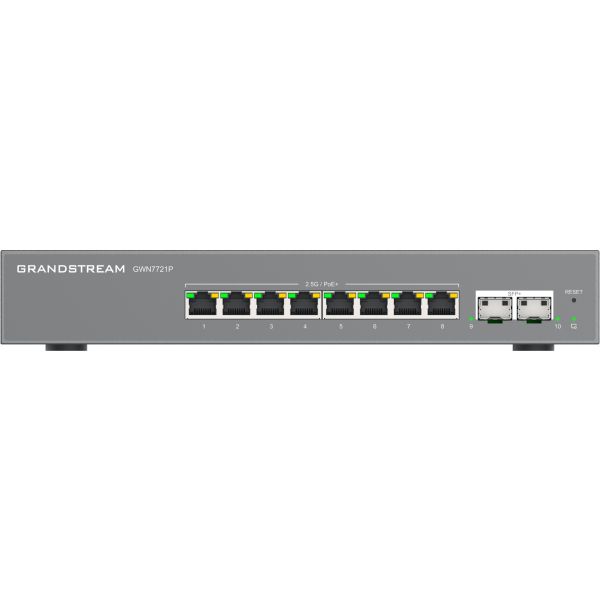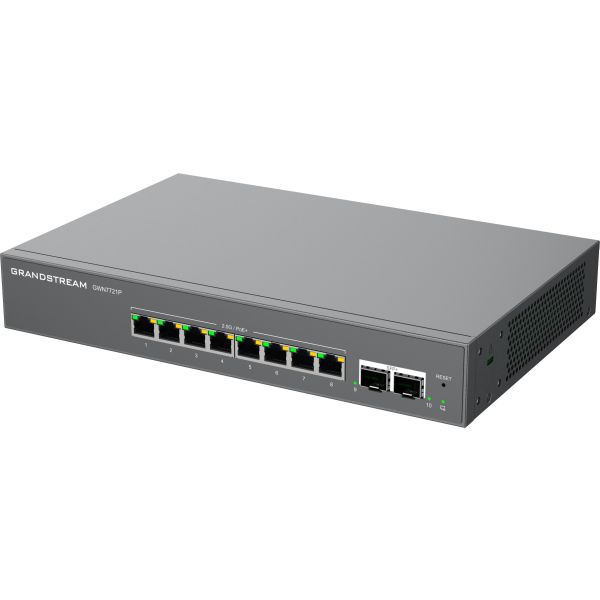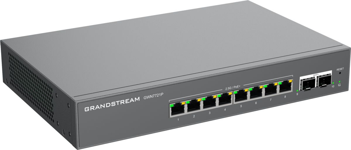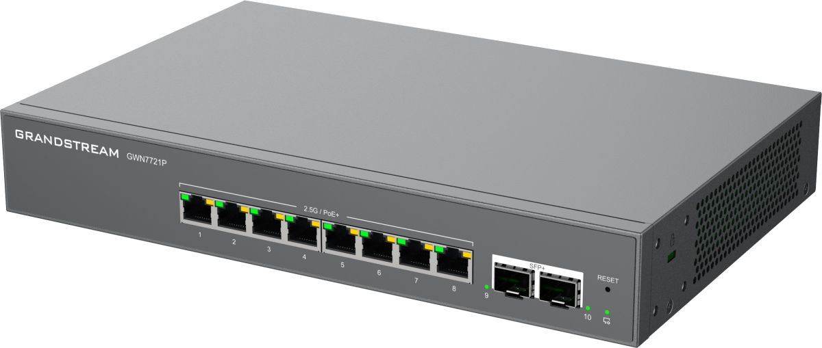 GWN7721P je 10-portový managovateľný switch L2 Lite, vybavený 8x 2,5G ethernetovými portami a 2x 10gigabitovými SFP+ portami, vhodný pre malé a stredné podniky pre budovanie škálovateľných, bezpečných a inteligentných sietí.