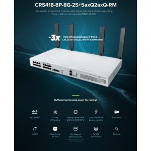 CRS418-8P-8G-2S+RM je ideálny pre hybridné sieťové prostredie Layer 2/3, či už segmentujete sieť pomocou VLAN alebo smerujete prevádzku medzi nimi. Vďaka výkonnému procesoru môže nahradiť bežné kancelárske routery a fungovať ako internetová brána, firewall alebo dokonca ako CAPsMAN kontrolér pre správu prístupových bodov.