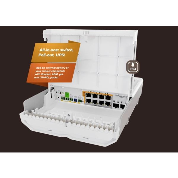 MikroTik netPower Lite 8P Nízka cena. Odolnosť. A vždy zapnuté! Kompaktný PoE switch s vstavanou UPS a inteligentnou nabíjačkou baterií – pretože vaše CCTV kamery a prístupové body si zaslúžia…