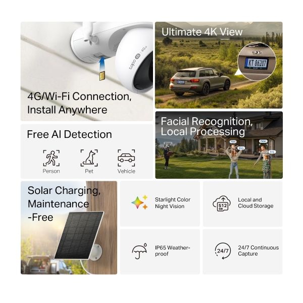 Vďaka solárnemu napájaniu, inteligentnej detekcii osôb, vozidiel a zvierat bez predplatného a odolnosti IP65 poskytuje spoľahlivý dohľad nad vašim majetkom za každého počasia.