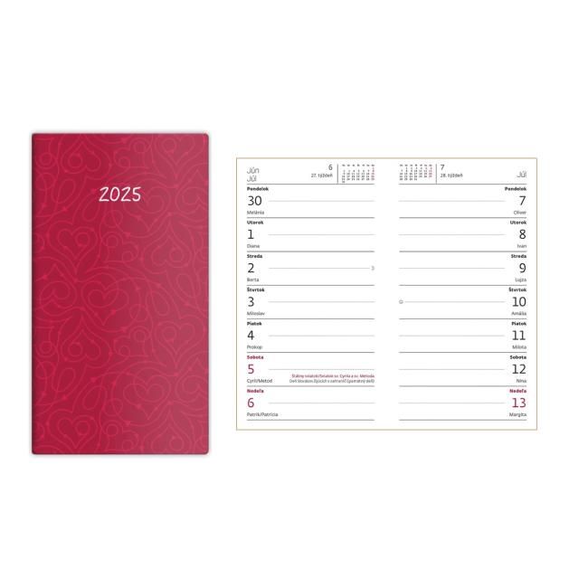 Rozmer: 148 x 210 mmFormát: A5Kalendárium: slovenské týždenné + jedna voľná strana na poznámkyRozsah: 128 stránPapier: bielyMateriál dosiek: hladká koženkaHlavný jazyk: slovenčinaĎalšie jazyky: CZInfostrany obsahujú:SK/CZ krstné mená, štátne sviatky SK/CZMesačný plánovač 2025 a 2026Prehľadný kalendár 2025 a 2026Plánovací kalendár, Daňový kalendár, Poznámky