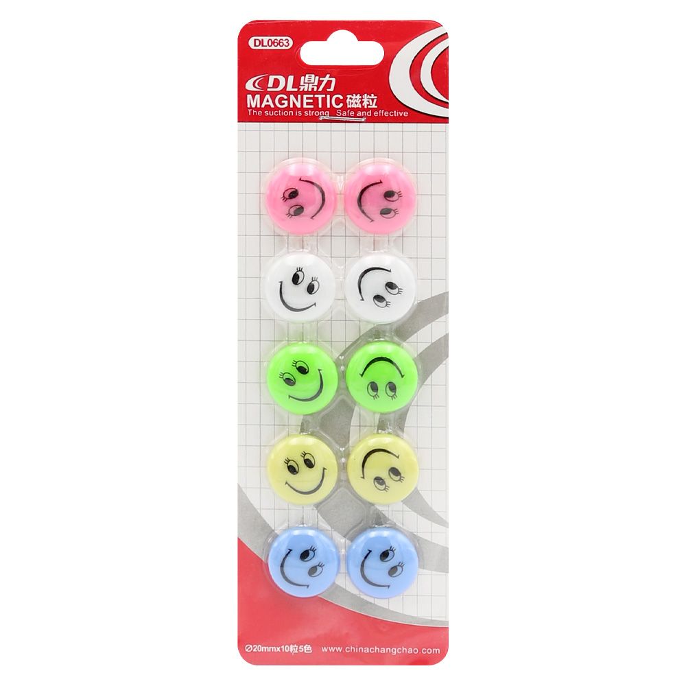 Magnetky "veselí smajlíci" vhodné na označenie skriniek v šatniach škôlky /školy, pripnutie papierových poznámok na chladničku, magnetickú tabuľu a pod. rozmer magnetky: 30 x 7 mm (priemer x hrúbka) PVC materiál s magnetickým pásikom silná priľnavosť balenie obsahuje 10 ks magnetiek päť jasných pastelových farieb