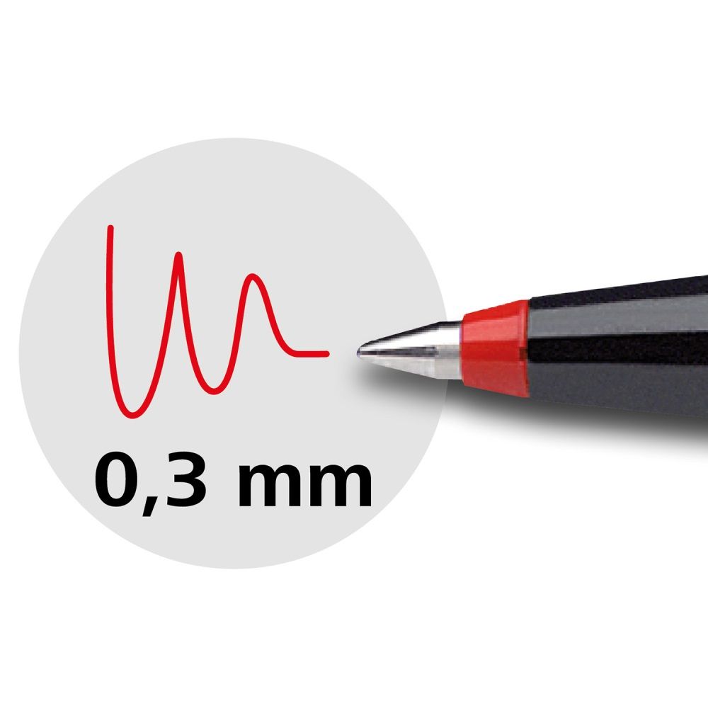 Roller v novom ergonomickom dizajne s jemným kovovým hrotom s guľôčkou z karbidu wolfrámu a nevysychajúcim atramentom (vydrží 14 dní bez vrchnáka). Šírka stopy 0,3 mm, dĺžka stopy 2200 m. Väčšie balenie 10 ks. Farba: červená