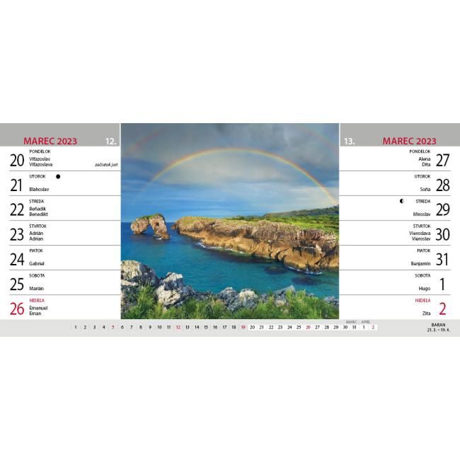 Formát kalendára: 32,1 x 13,4 cmKalendárium: české/slovenské týždenné stĺpcovéPočet strán kalendára: 60 + 2Stojanček: so zámkomPriestor na potlač: 32,1 x 3,5 cm+ ročné obdobia, 3mesačný prehľad