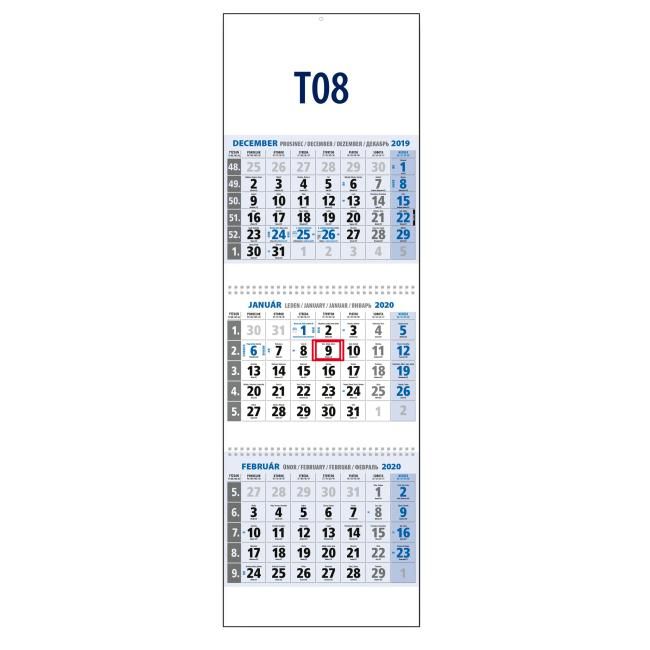 Plánovací 3-mesačný modrý kalendár s priloženou hornou čistou lištou, s menami v SK + CZ, názvy mesiacov a dní v SK, CZ, UK, DE a HU.Formát: 295 x 663Rozsah: 12 listovKalendárium: SK/CZ