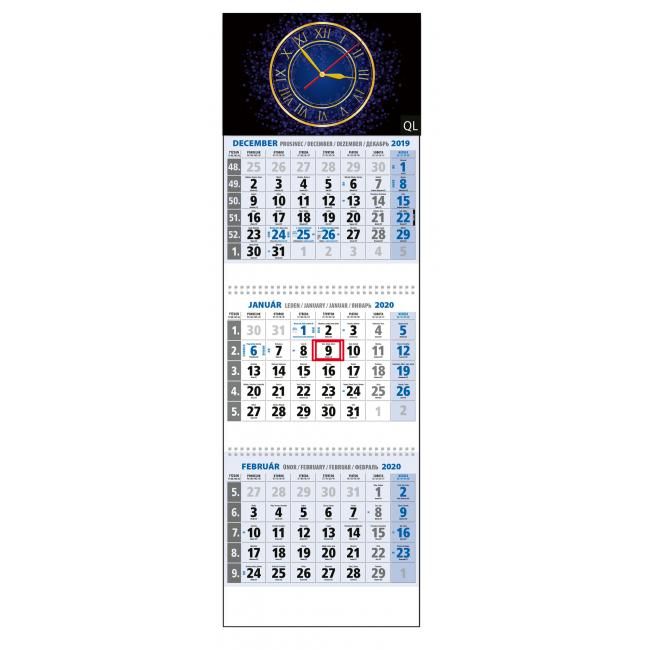 Rozmery: 295 x 925 mm. ROZSAH: 3 x 12 listov. KALENDÁRIUM: 3-mesačné s menami SK, názvy mesiacov a dní v SK. VÄZBA: 1x šitá s perforáciou, 2x špirála. REKLAMNÁ POTLAČ: 2 x 295 x 30 mm, 295 x 60 mm. BALENIE: 20 ks.S hodinami QL.