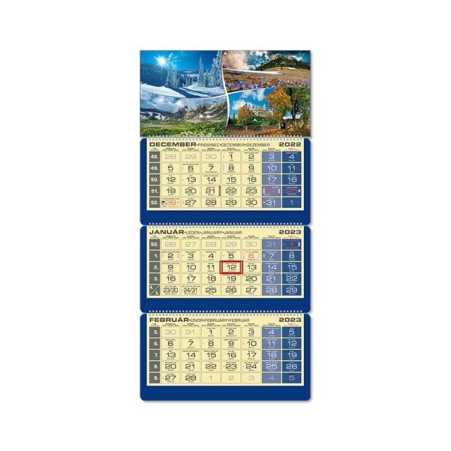 Plánovací kalendár 3-mesačný sivý. Rozmer : 295x870 mm. Rozsah: 3 x 12 listov. Väzba: 1x šitá s perforáciou a 2x špirála.