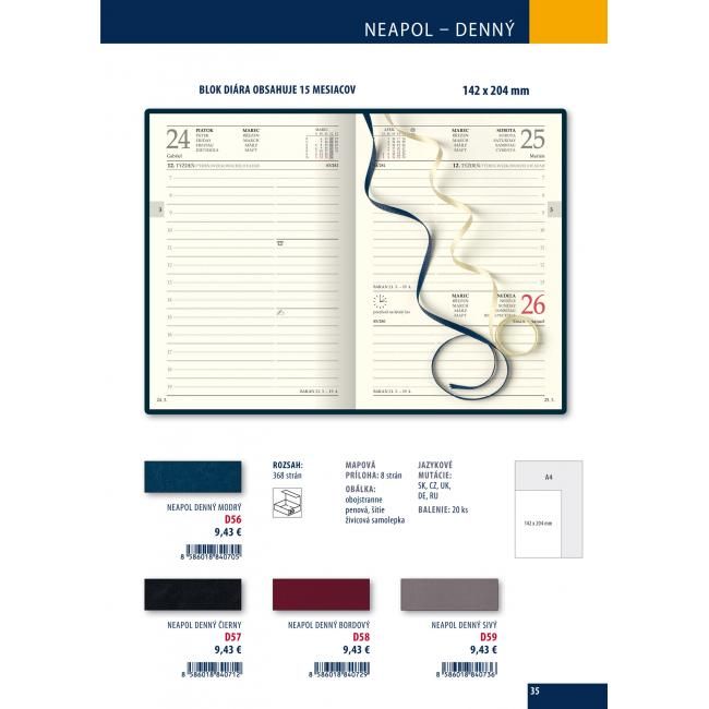 Diáre Napoli Obľúbený laminovaný povrch príjemný na dotyk, prinášame v úplne novej grafickej úprave.Rozmery: 15.4 x 8.5 CM