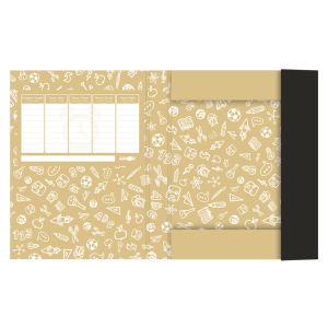 Nevyhnutná súčasť vybavenia každého školáka na uloženie zošitov, papierov a ďalších školských pomôcok. odolný materiál - lamino, chráni proti poškodeniu zatváranie na gumičku šírka chrbta 3 cm hmotnosť: 150g