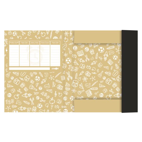 Nevyhnutná súčasť vybavenia každého školáka na uloženie zošitov, papierov a ďalších školských pomôcok. odolný materiál - lamino, chráni proti poškodeniu zatváranie na gumičku šírka chrbta 3 cm hmotnosť: 169g