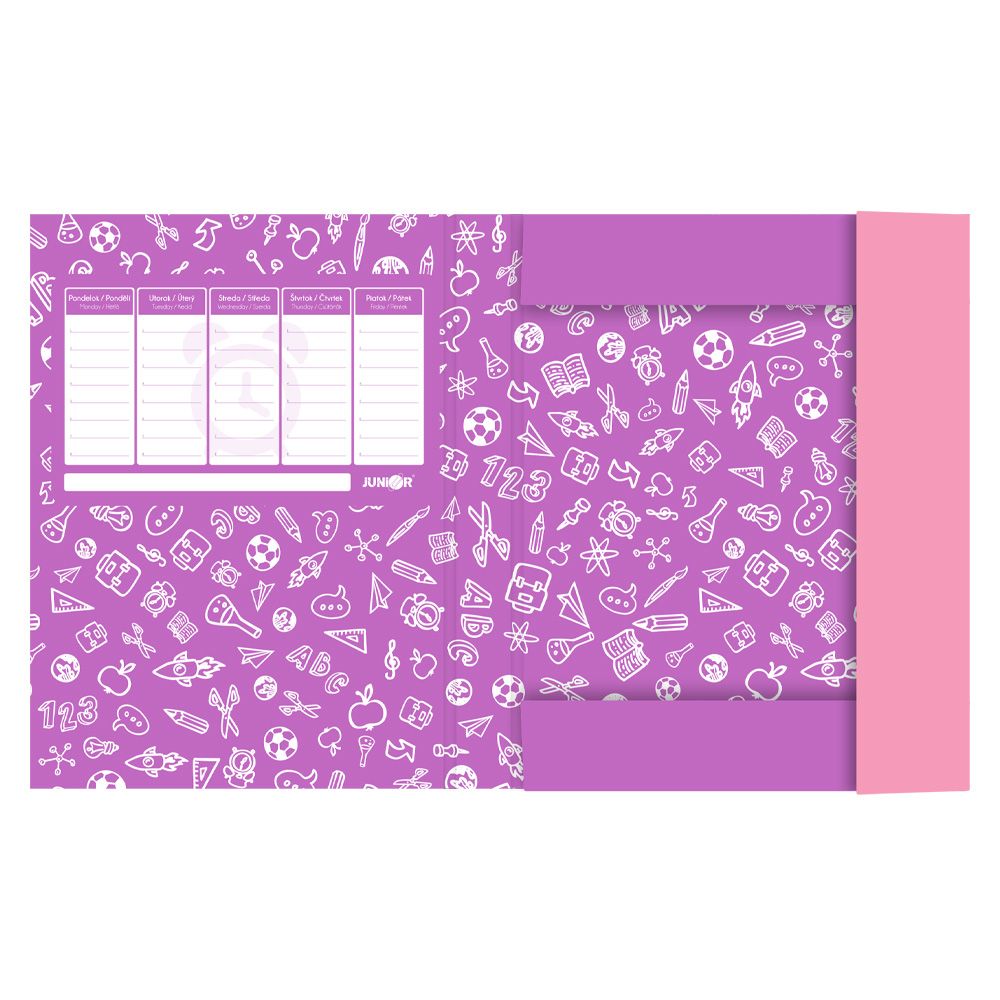 Box na zošity formát Jumbo A4, zatváranie na gumičku. Výhodou sú 3 chlopne z tvrdeného kartónu, ktoré chránia zošity a knihy proti poškodeniu. Odolný, kvalitný materiál. Nevyhnutná súčasť vybavenia každého školáka na uloženie zošitov a kníh.