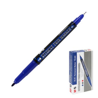 Obojstranný permanentný popisovač Student Twin Marker M&G. Permanentný atrament na báze liehu, odolný voči vode a vyblednutiu, rýchloschnúci. Píše na papier, gumu, kožu, plasty, kovy. Extra tenký hrot – šírka stopy 0,5 mm. Tenký hrot – šírka stopy 1,0 mm. Farba: modrá.
