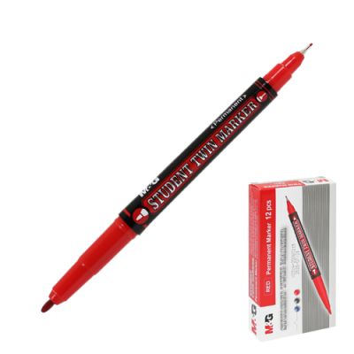 Obojstranný permanentný popisovač Student Twin Marker M&G. Permanentný atrament na báze liehu, odolný voči vode a vyblednutiu, rýchloschnúci. Píše na papier, gumu, kožu, plasty, kovy. Extra tenký hrot – šírka stopy 0,5 mm. Tenký hrot – šírka stopy 1,0 mm. Farba: červená.